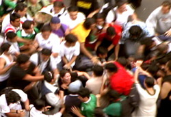 conforman este video. 1. El gesto de la masa: una multitud se abalanza sobre comida.